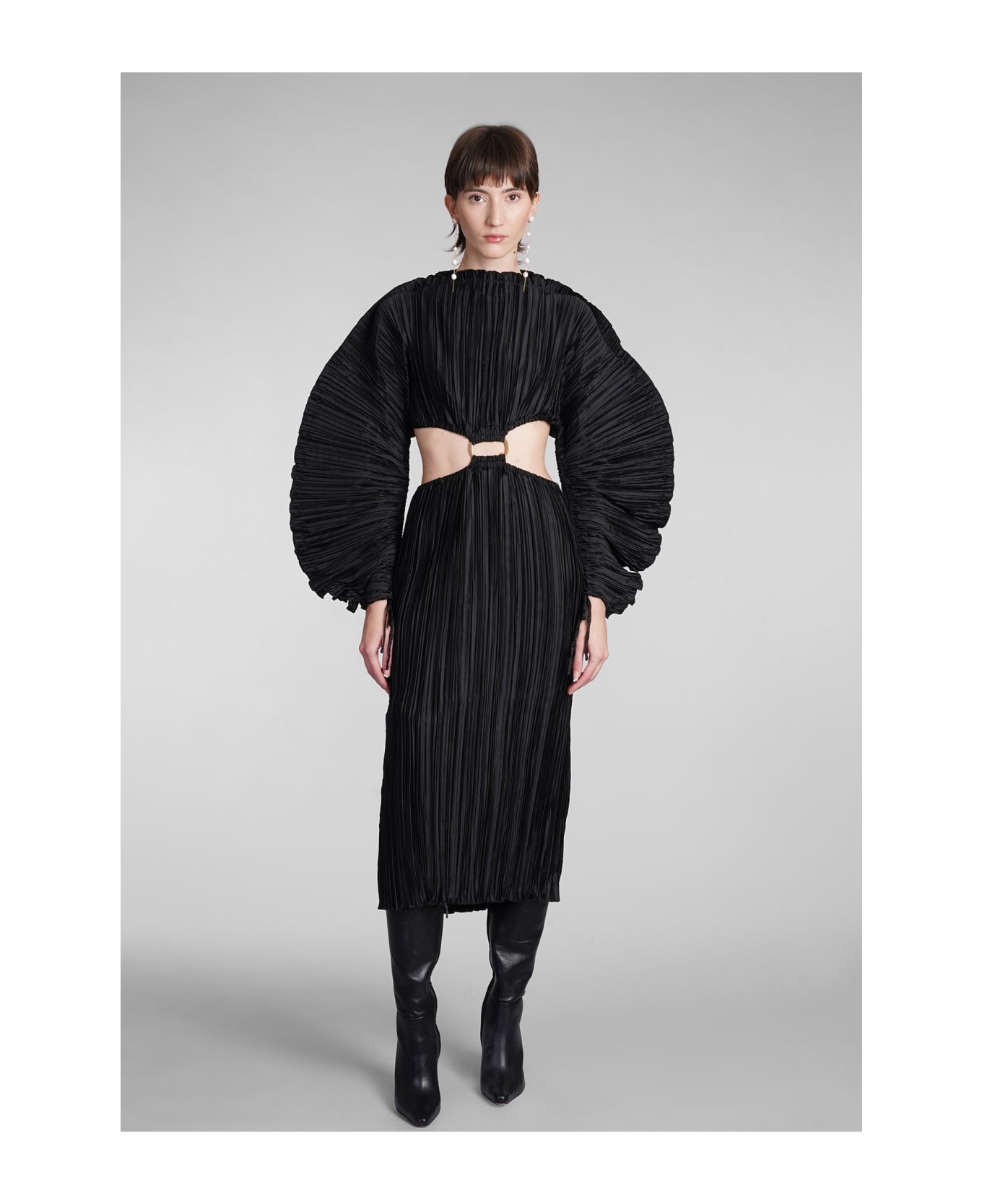 Akilah dress Dress in black polyester, pleated design, cut out detail, zip clousure, long sleeves, iconic ring detail, 100% polyester, Model is 180 cm and wear a size S