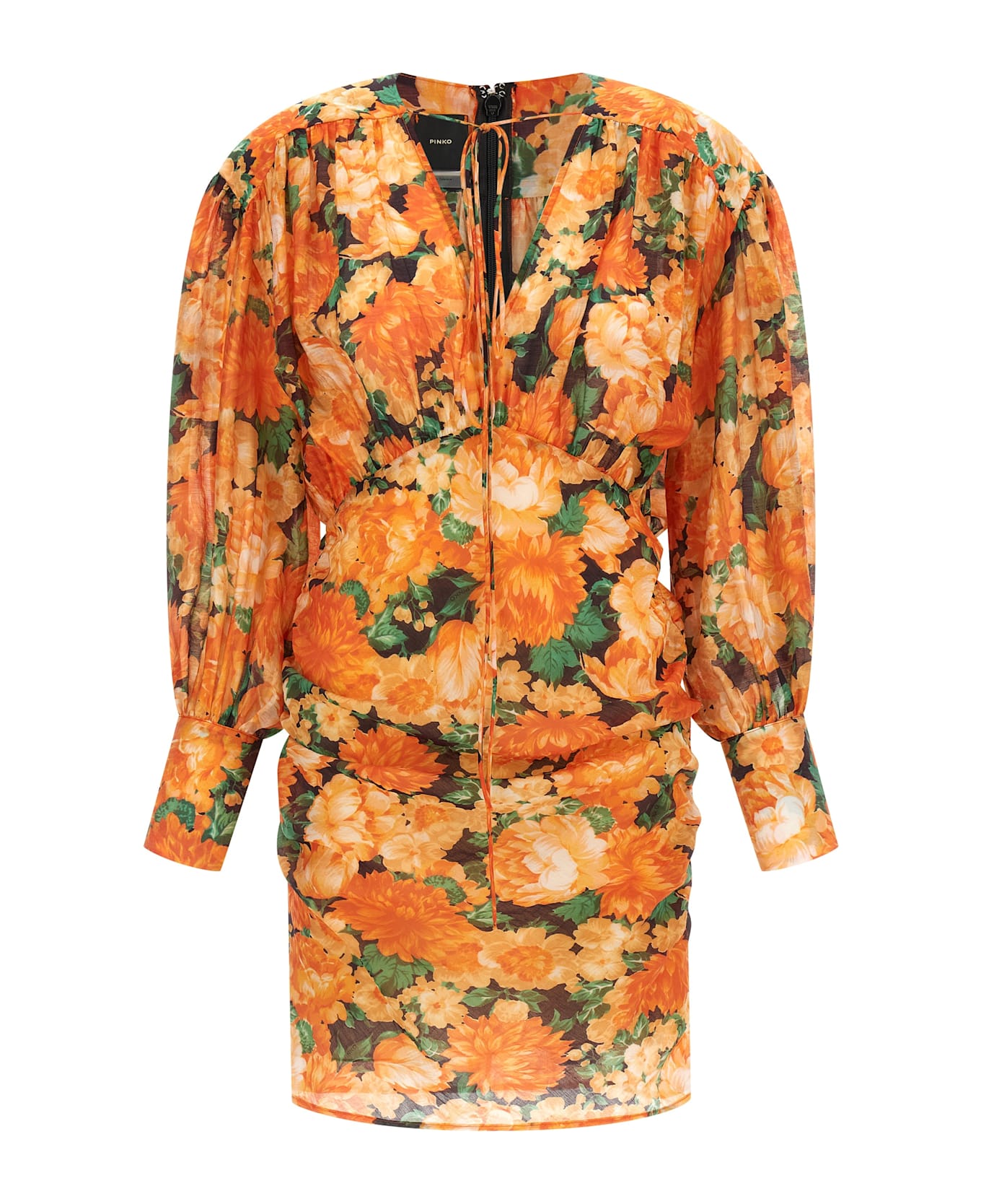 Mini 'Apericena' dress in lightweight voile fabric of flamed effect lyocell blend with all-over 'Botanic Garden' print, wide upper part with deep front V-neck with ribbons to cross and tie as desired, long balloon sleeves with slightly flared buttoned cuffs, back zip closure, straight skirt with draping and curls, lining.