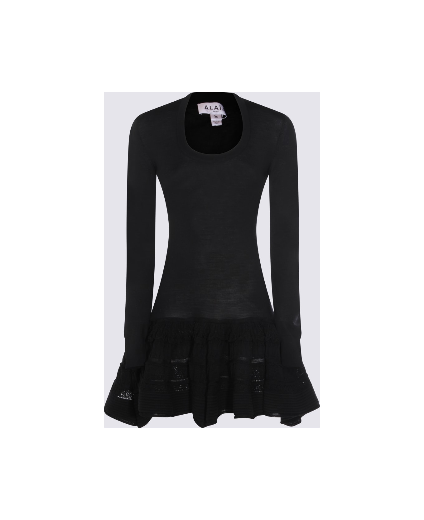 Black wool dress from Alaia featuring round collar, long sleeves, mini lenght and ruffles. Composition: _, 97% Wool, 2% Polyamide, 1% Elastane