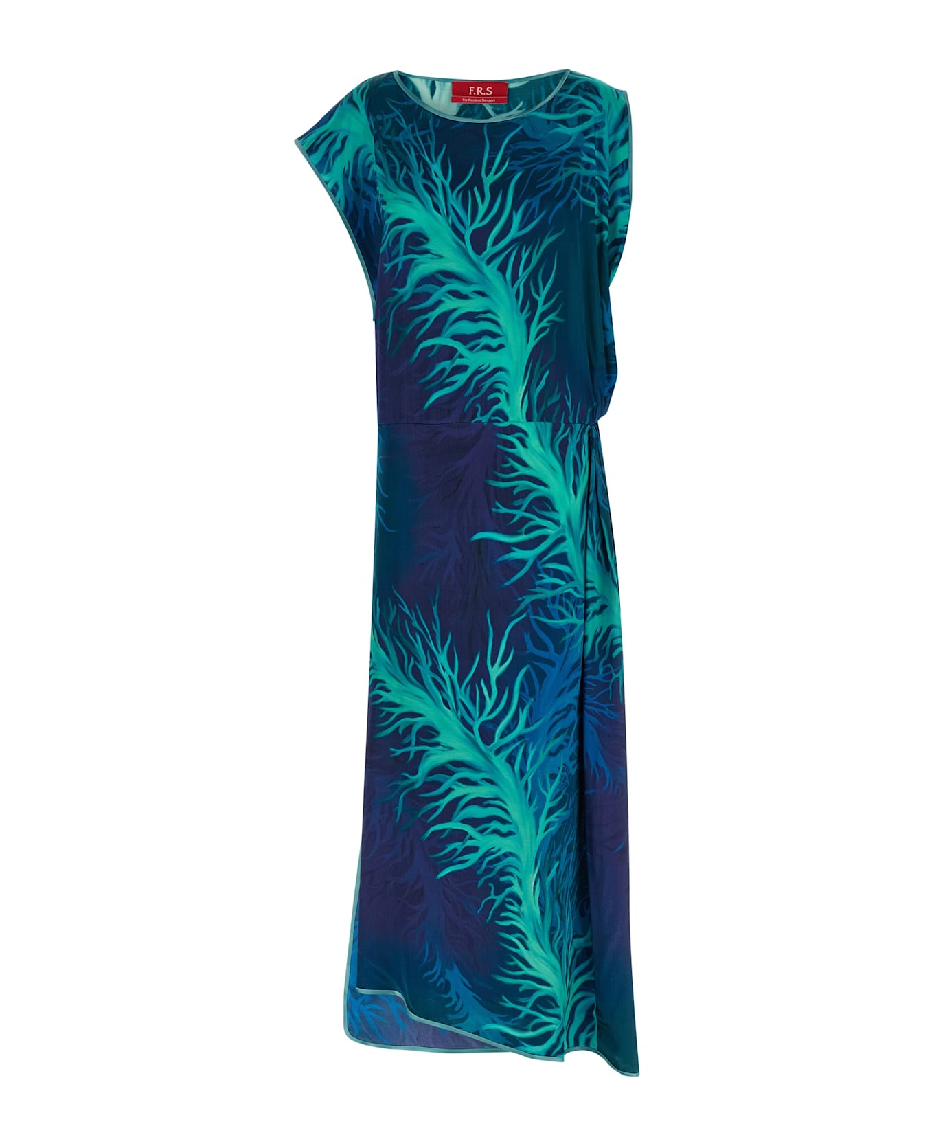 'Briseide' long dress in silk viscose satin with 'Corals Blue' print, solid color piping, asymmetrical construction, draped waistband, round neckline, sleeveless, wide armholes, zip closure and wide side split.