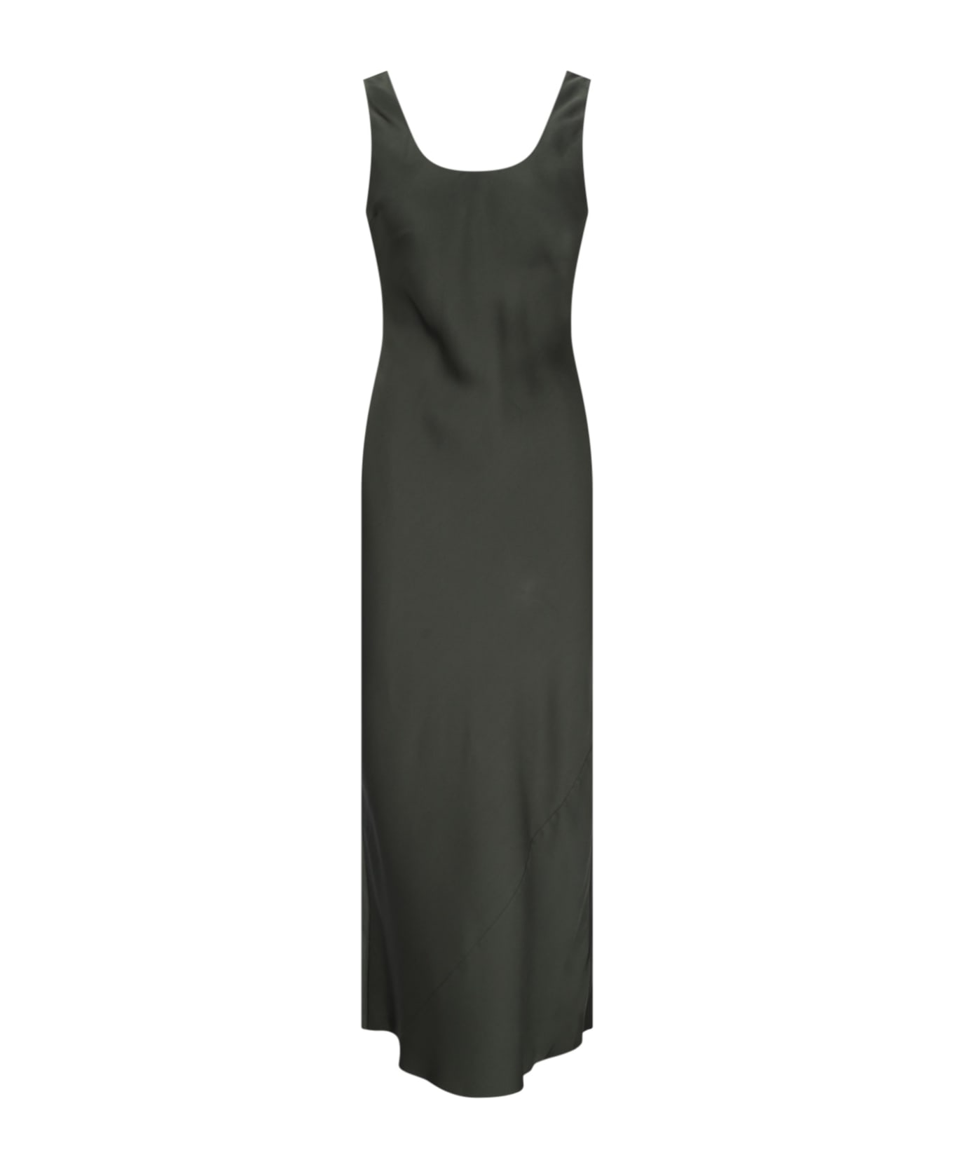 Anine Bing Camille maxi dress, in green silk, sheath design, front-back round neckline, sleeveless, straight hem.