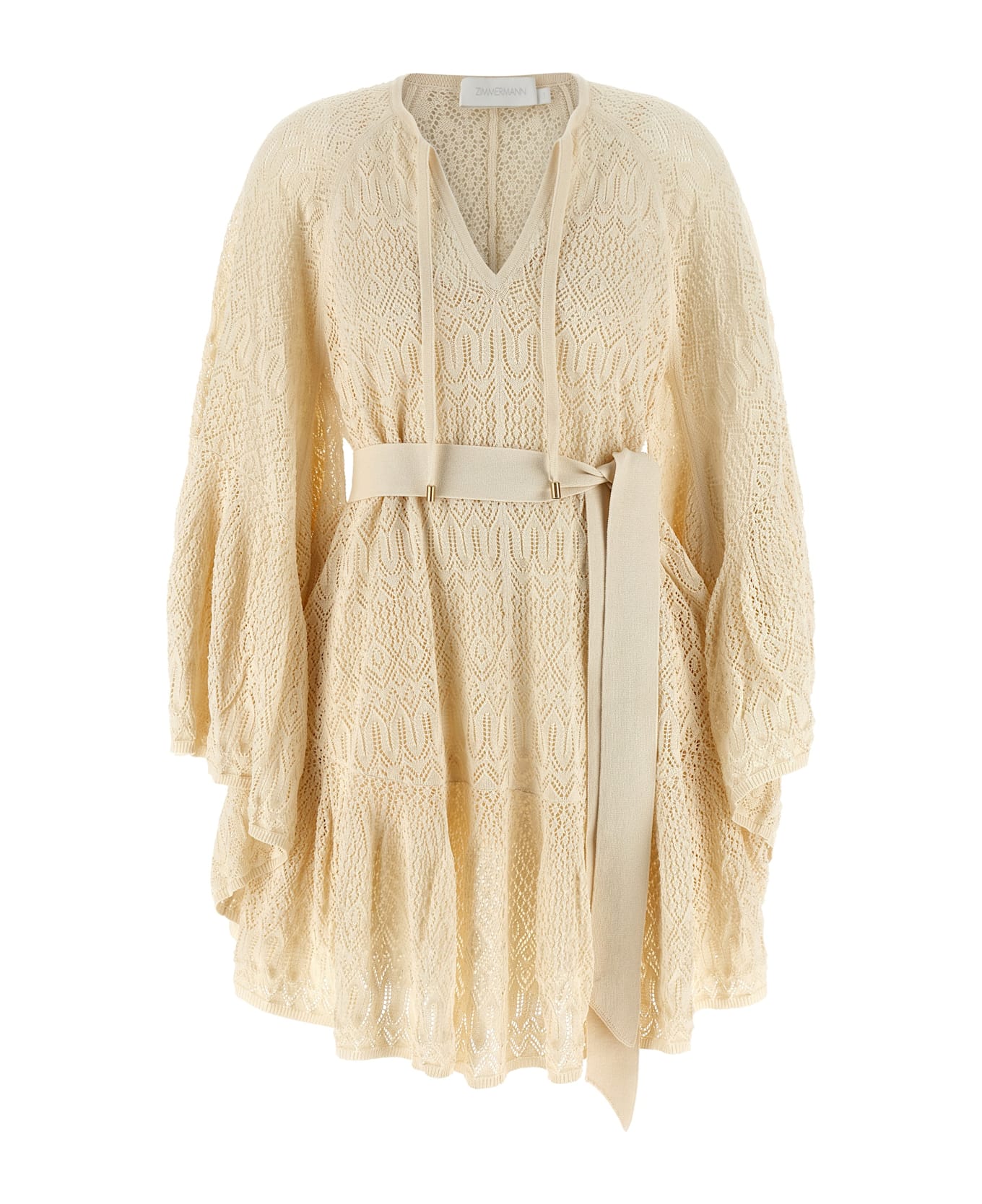 'Coco Pointelle Lace' lace knit mini dress, V-neck with drawstring, long bat sleeves with ruffle on the cuff, removable belt, removable cotton petticoat. Composition: 58% paper yarn, 42% polyester