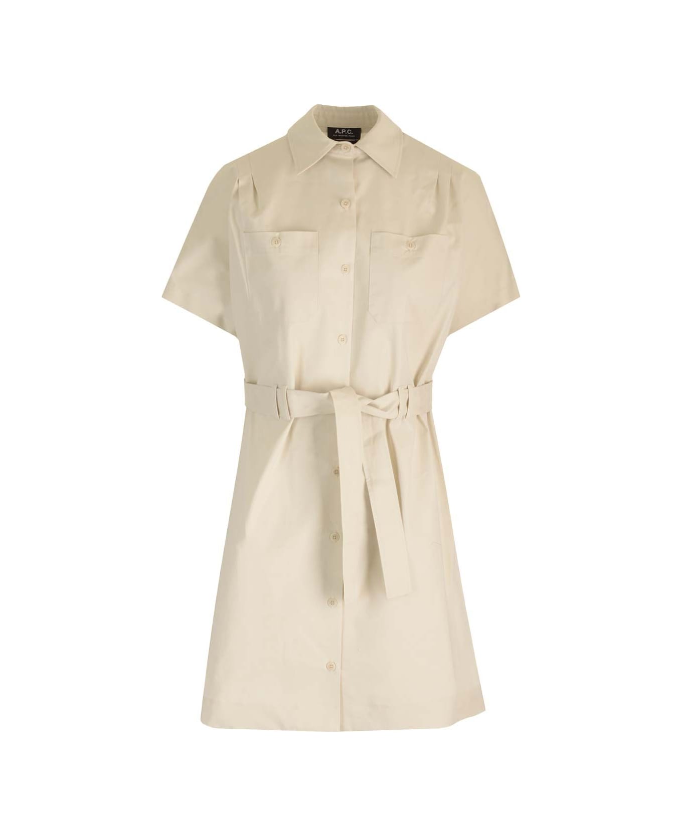 "Drew Courte" mini organic cotton chalk-colored shirt dress from A. P. C. , with tone-on-tone button front fastening, classic collar, short and wide cuffs, removable waist belt and two chest pockets.
