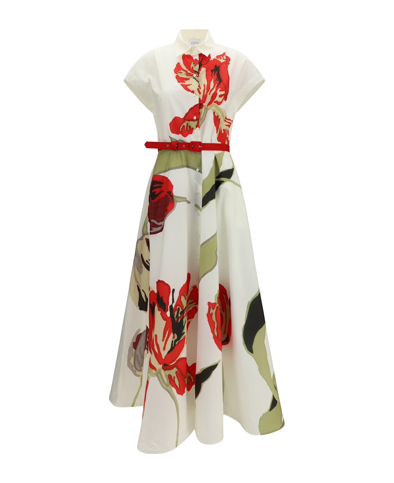 The elodie dress by sara roka is crafted from cotton and features an all-over print. it is designed with short sleeves and a waist belt, enhancing the silhouette with an elegant touch.