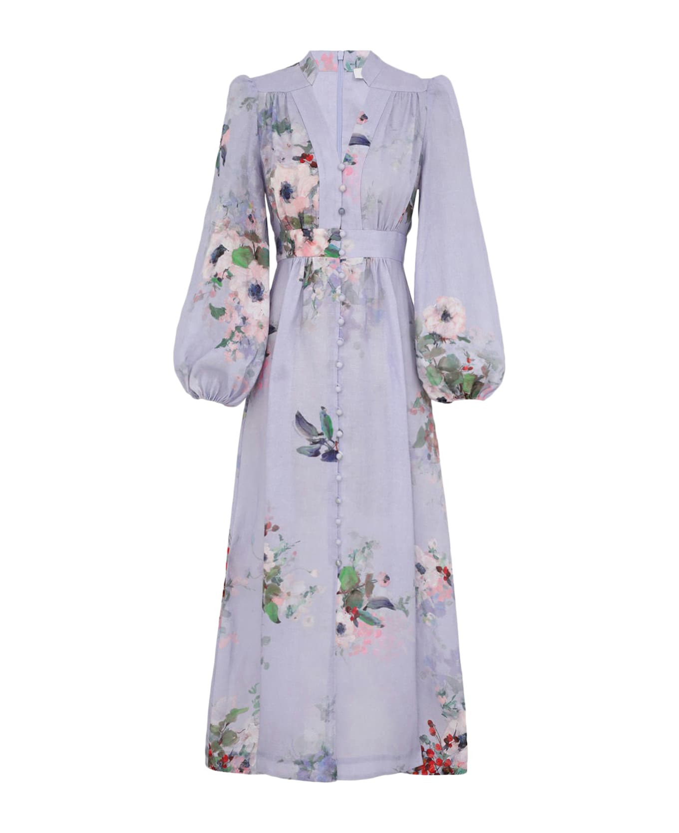 -Linen dress -V-neck -Puff sleeves with elastic cuffs -Button down the front -Invisible zipper closure at the center back