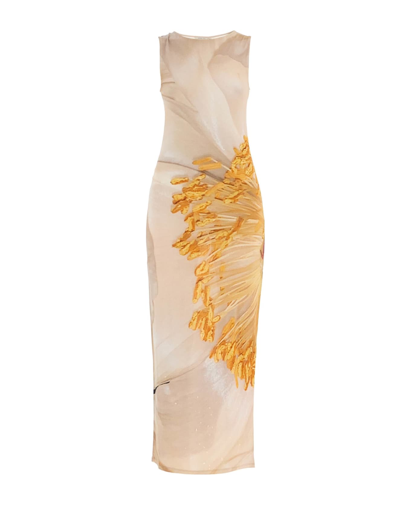 The Paloma Wool long sleeveless dress is embellished with a large all-over floral print. Made from lightweight, stretchy FSC viscose jersey, it features a fluid column silhouette with a round neckline. The model is 177 cm tall and wears size S.