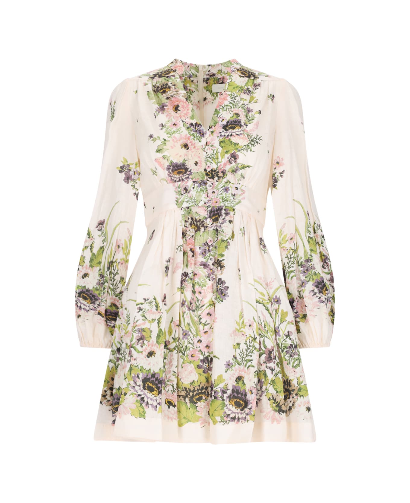 Zimmermann "Halliday Plunge" mini dress in cream linen with multicolor details, all-over floral print pattern, deep V-neck, three-quarter wide sleeves, button closure, elastic band at the waist, back zip closure, straight hem.