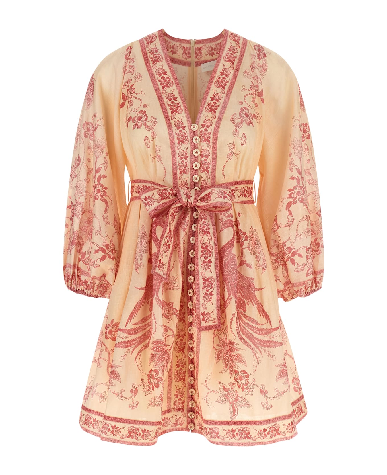 Lucky Plunge' all-over print linen dress, V-neck with button detail, flared hem, back zip closure, puff sleeves with elastic and curled hem.
