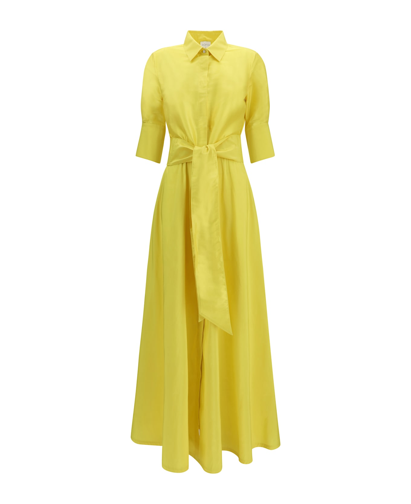 The marysole long dress by sara roka is a long shirt dress with a full-length front button closure, short bell sleeves, and a wide flared skirt. made from white polyester techno taffeta, it features a light yet structured construction. the style is completed with a matching fabric belt to define the waist and adjust the fit. a dress suitable for elegant occasions, events, and ceremonies.