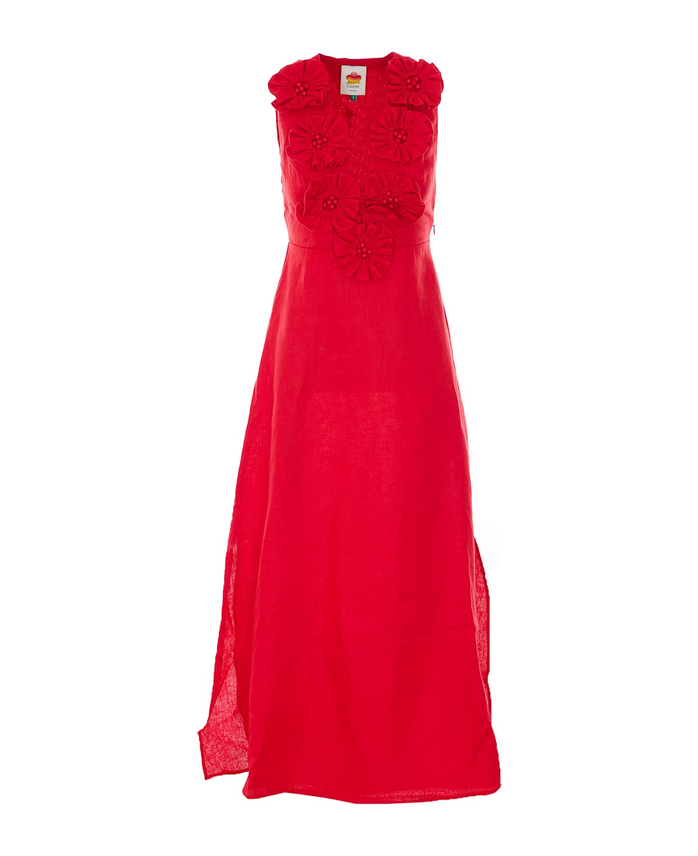 Farm Rio red dress, V-neck, lateral zip and hook closure, floral printed, lateral split, application floral detail