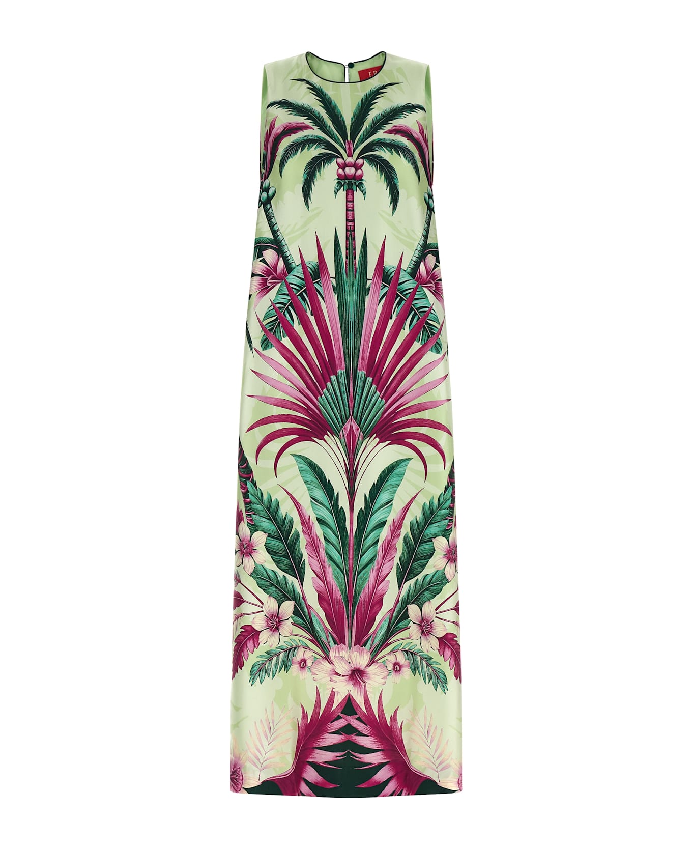 Long 'Penelope' dress in 'Palm bouquet' print silk twill, flared silhouette, crewneck with back button closure and cut-out teardrop detail, sleeveless, sides with wide slits and buttons.
