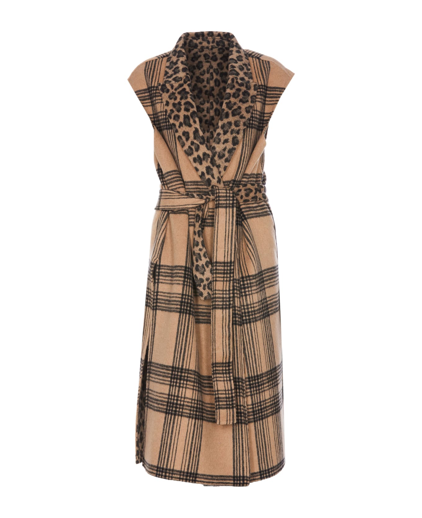 Twinset brown reversible cape, one side with animalier print, one side with check motif, pockets, belt detail, sleeveless, splits on side, v-neck, reverse detail