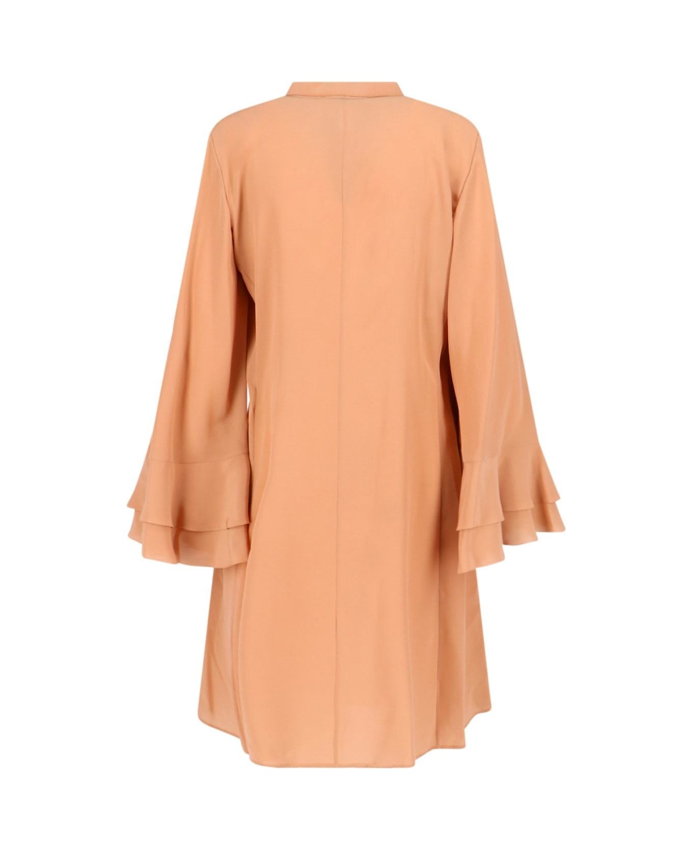 Chloé ruffle midi dress in pink silk, Korean collar, button closure, wide sleeves, ruffle detail cuffs, straight hem.
