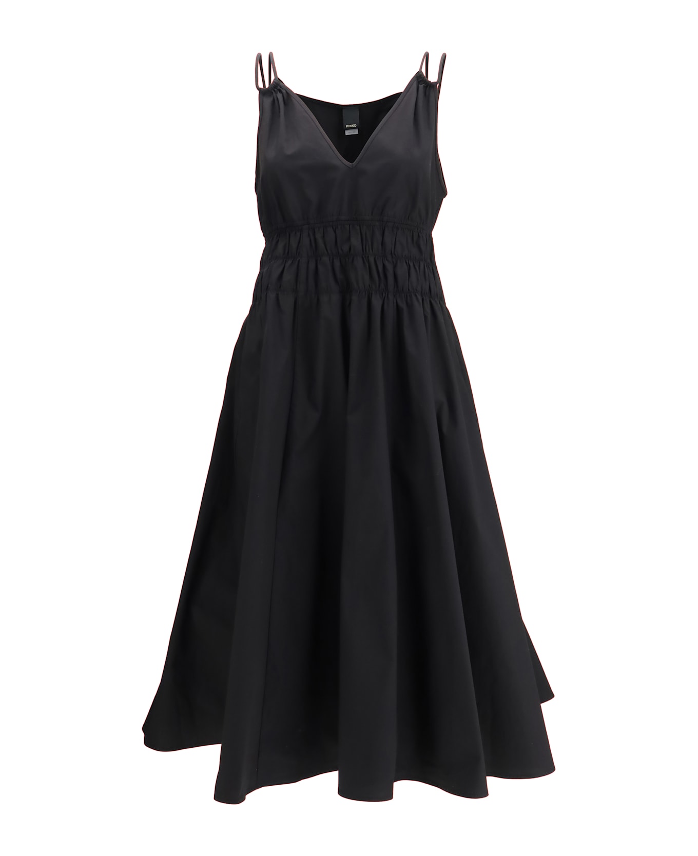 The shirred v-neck dress by pinko brings a refined sense of ease through delicately gathered detailing that enhances the silhouette. the v-neckline and slender straps create a clean, feminine line, while the a-line skirt adds fluidity to the design. a versatile piece crafted to elevate everyday moments with understated elegance.