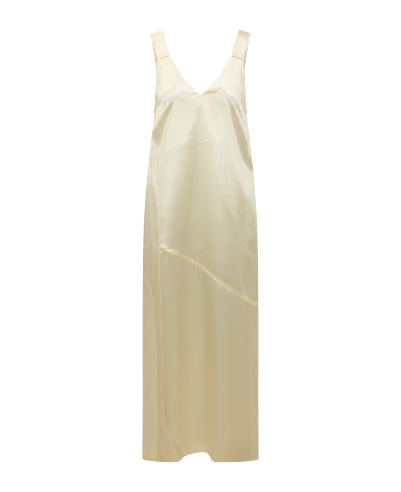 Midi sleeveless dress. V-neck on the front. Side zip closure. Side slit.