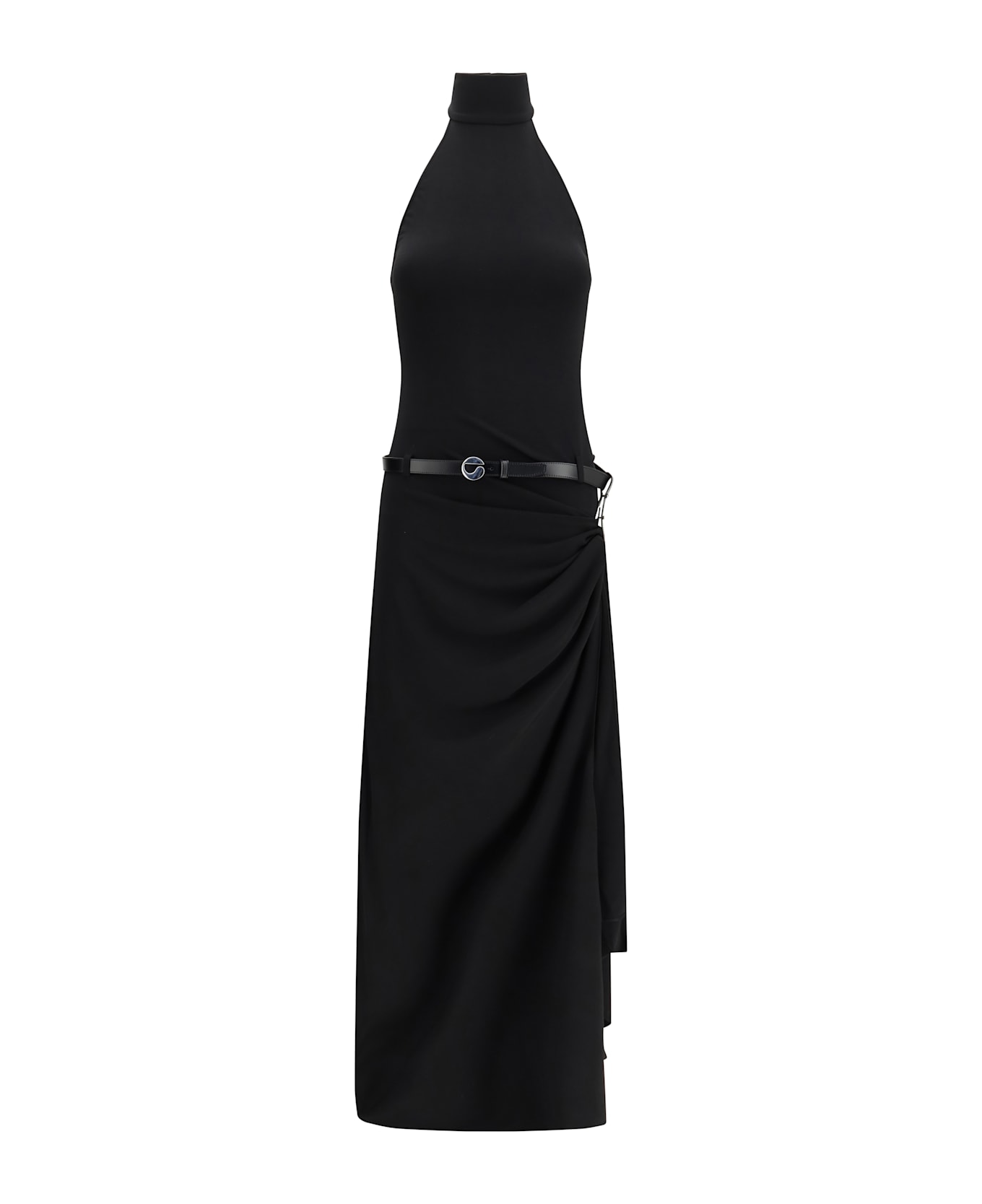 The suspended halterneck dress by coperni is a floor-length halterneck gown featuring a draped skirt and side slit. fully lined, it is draped at the hip to create fluid movement and a refined structured contrast. the sculpted bodice showcases a high neckline and bare shoulders, finished with a concealed side zip for effortless fastening.