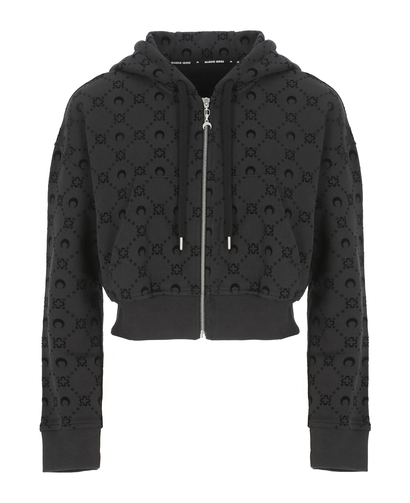- Blacl Marine Serre cotton hoodie for woman - Hood with drawstrings - Long sleeves - Two side slit pockets - Elastic ribbed trims - All-over Moon logo pattern - Rear logoed tab - Front zip fastening -