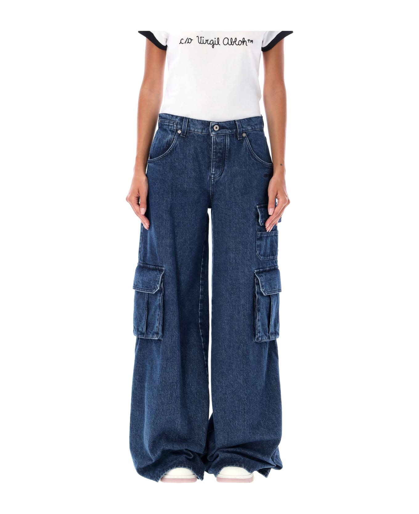 Cargo Wide Jeans By Off-white. Featuring: Cotton Denim Fabric Wide-leg Fit Front Button And Zipper Closure Distressed Detailing Two Side Cargo Pockets With Flaps Two Back Pockets Two Front Pockets Model Is 1,72m And Wears Size 26.