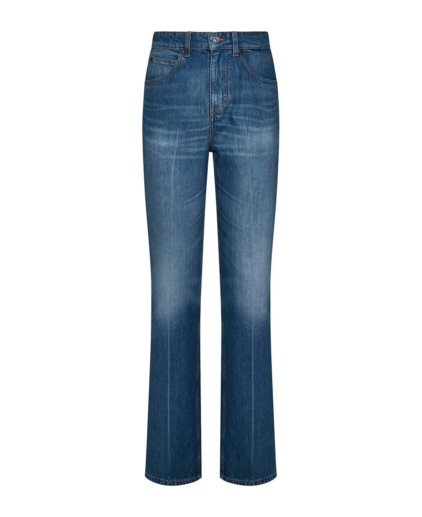 Covered Front Closure, Silver Button High Waist With Belt Loops Five Pocket Design Leather Logo Patch At Back Waistband Tobacco-colored Topstitching; Copper Logoed Rivets Vintage Wash Relaxed Leg Regular Fit Blue Color , 100% Cotton Made In Italy