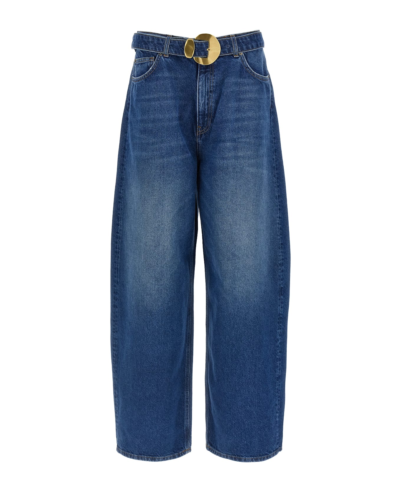 Stonewashed cotton denim jeans with loose ballon leg, high waist, front zip and button closure, five pockets, back logo tag, belt with maxi removable antiqued effect metal buckle.
