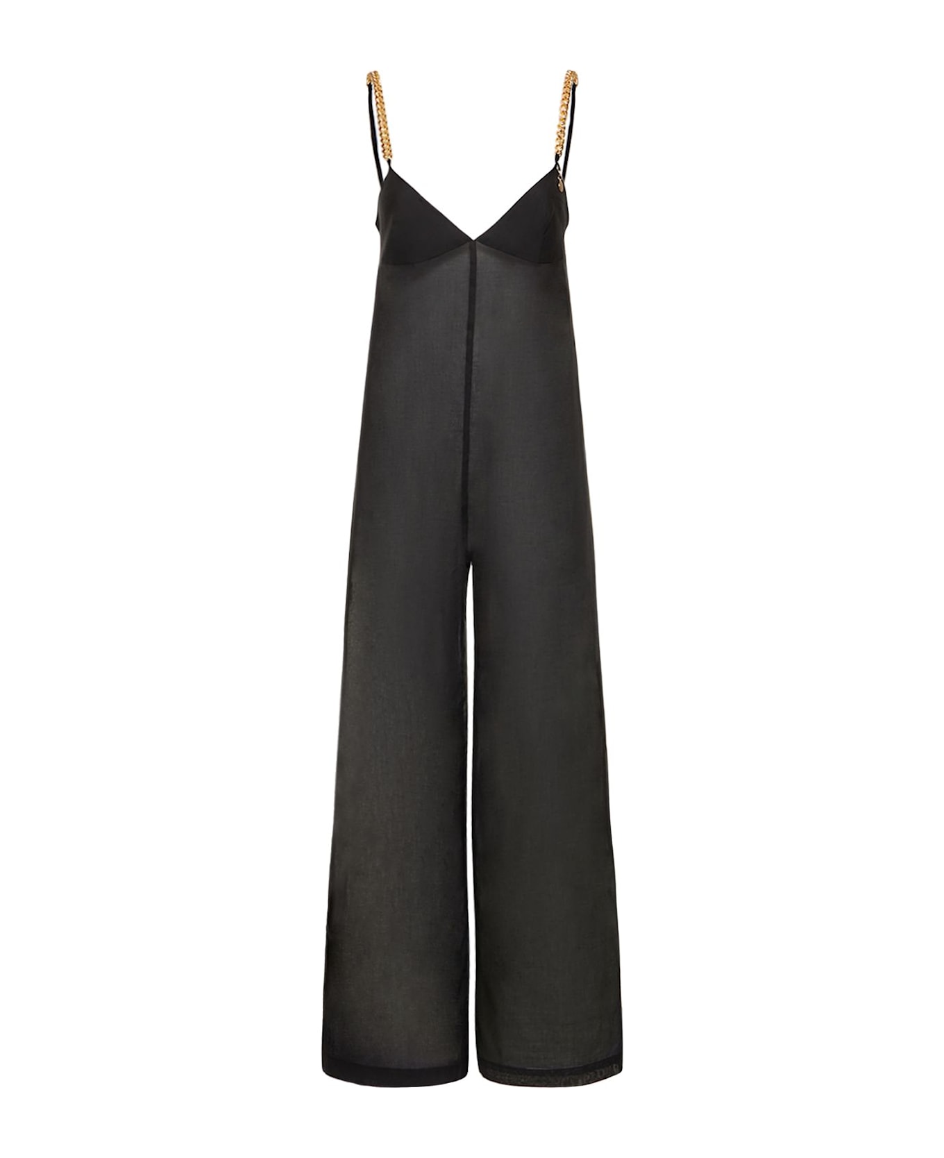 This elegant jumpsuit features a palazzo design with a wide silhouette that offers comfort and freedom of movement. made from a lightweight fabric, the garment has thin straps and a v-neckline that add a touch of femininity. ideal for casual or more formal occasions, it can easily be paired with sneakers for a daily look or high heels for a special event. the black color makes it a versatile piece to add to your wardrobe.