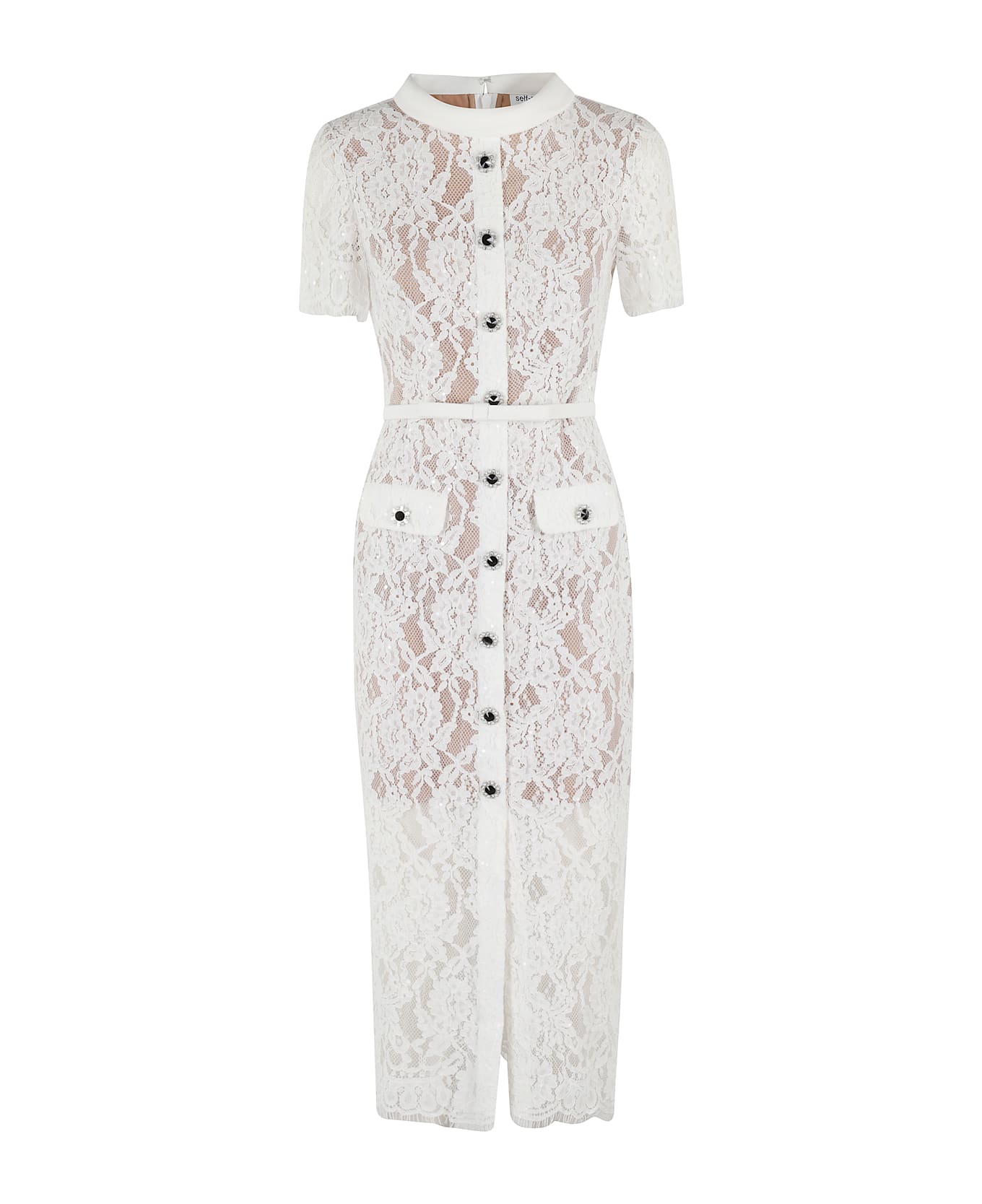 Lace Button Midi Dress - Self-Portrait - White color - Fabric with lace and sequin work - Crew neck - Short sleeve - Side pockets with flap and jewel button - Front applications with jewel buttons - Removable waist belt - Back zipper closure - Fitted fit