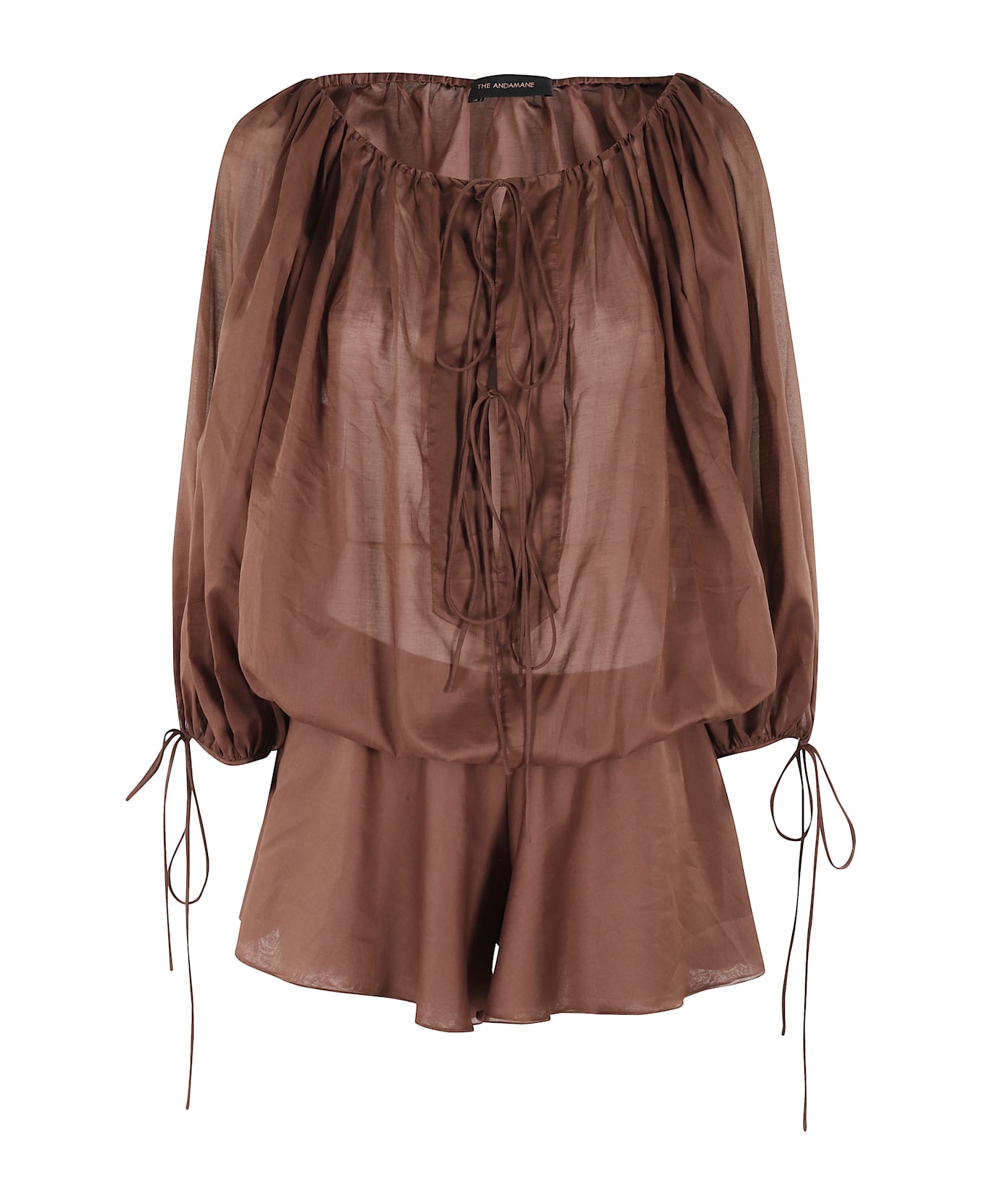 Wilma jumpsuit - The Andaman - Mocha color - Cotton muslin fabric - Elasticized neckline with bare shoulders - Wide long sleeves with drawstring at bottom - Front opening with drawstring - Wide shorts - Loose fit