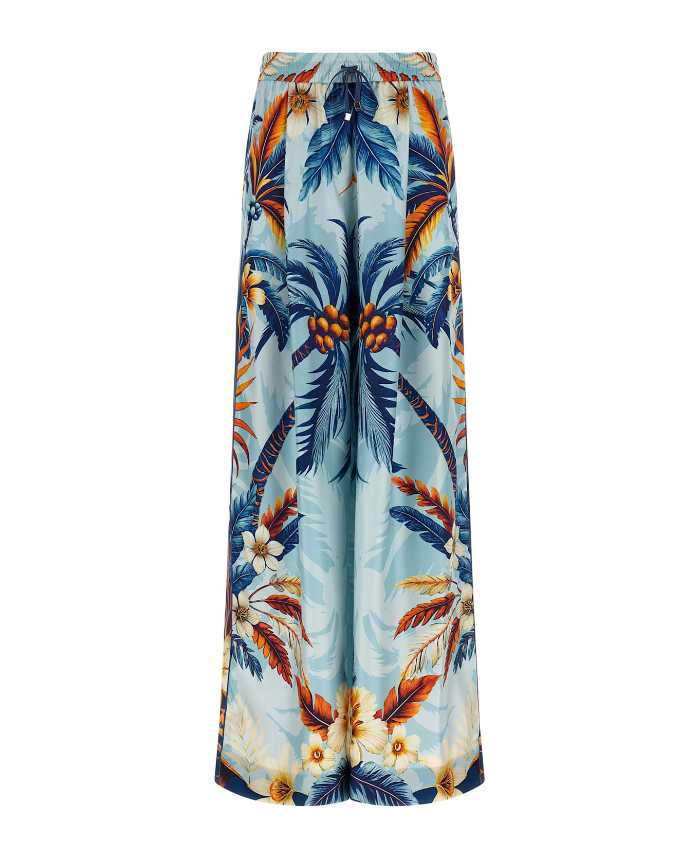 'Ecuba' all-over 'Palm Bouquet' print silk twill pants with solid satin details, drawstring elastic waistband, wide straight leg, pockets.