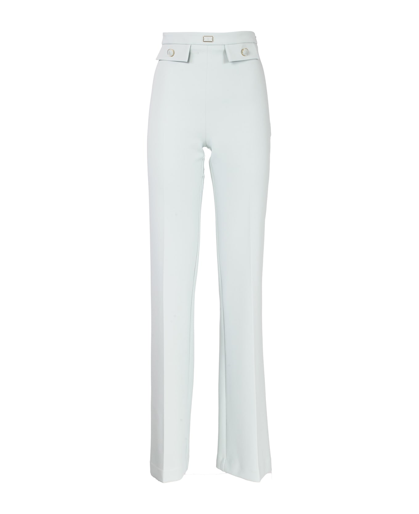 Elisabetta Franchi palazzo trousers in stretch cr with flaps. She lining in monogram satin. Invisible zip on her side. Matching buttons. Composition: 96% Polyester 04% Elastane. Made in Italy.