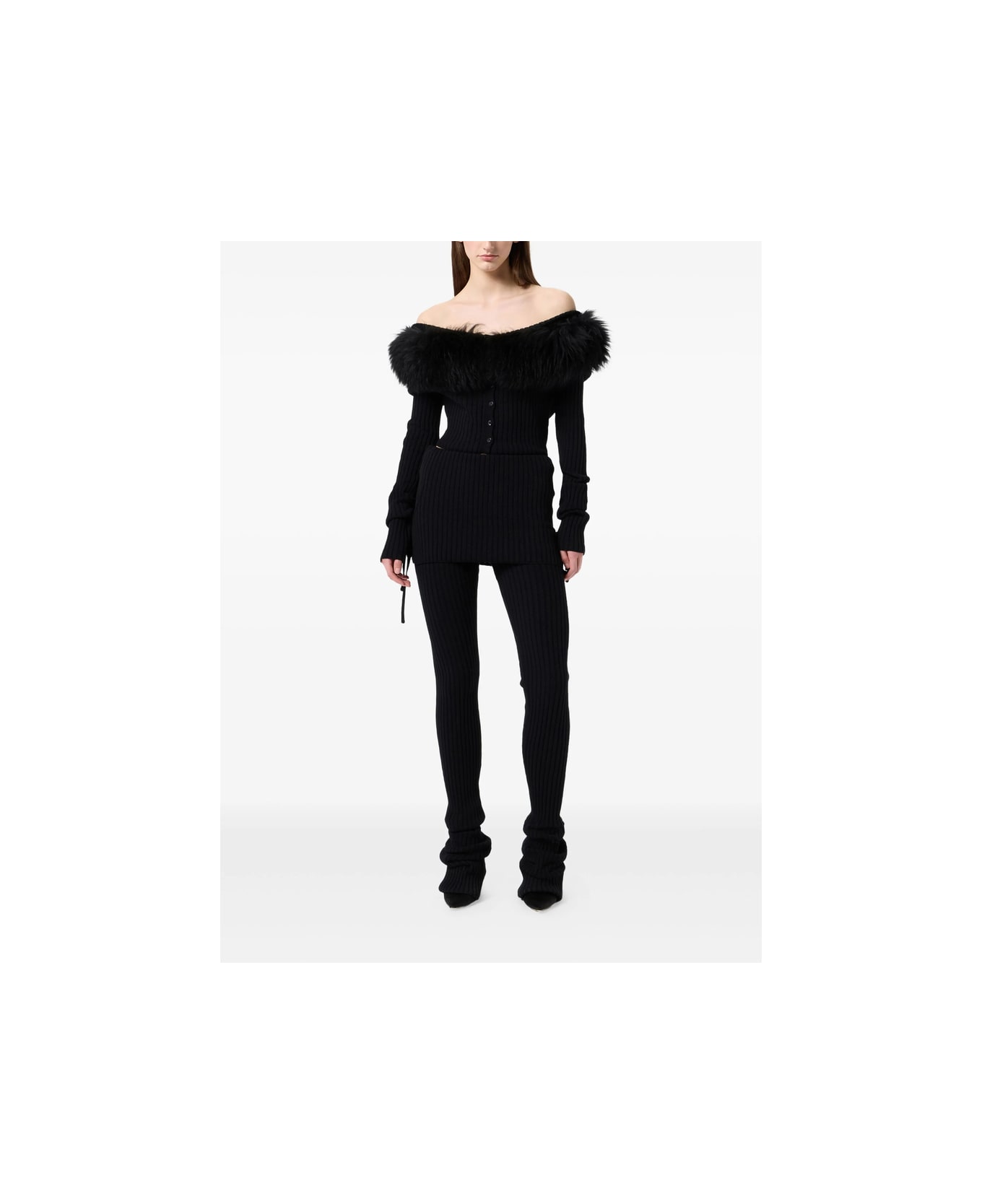 black ribbed knit attached mini-skirt tie fastenings sides ankle ruffles