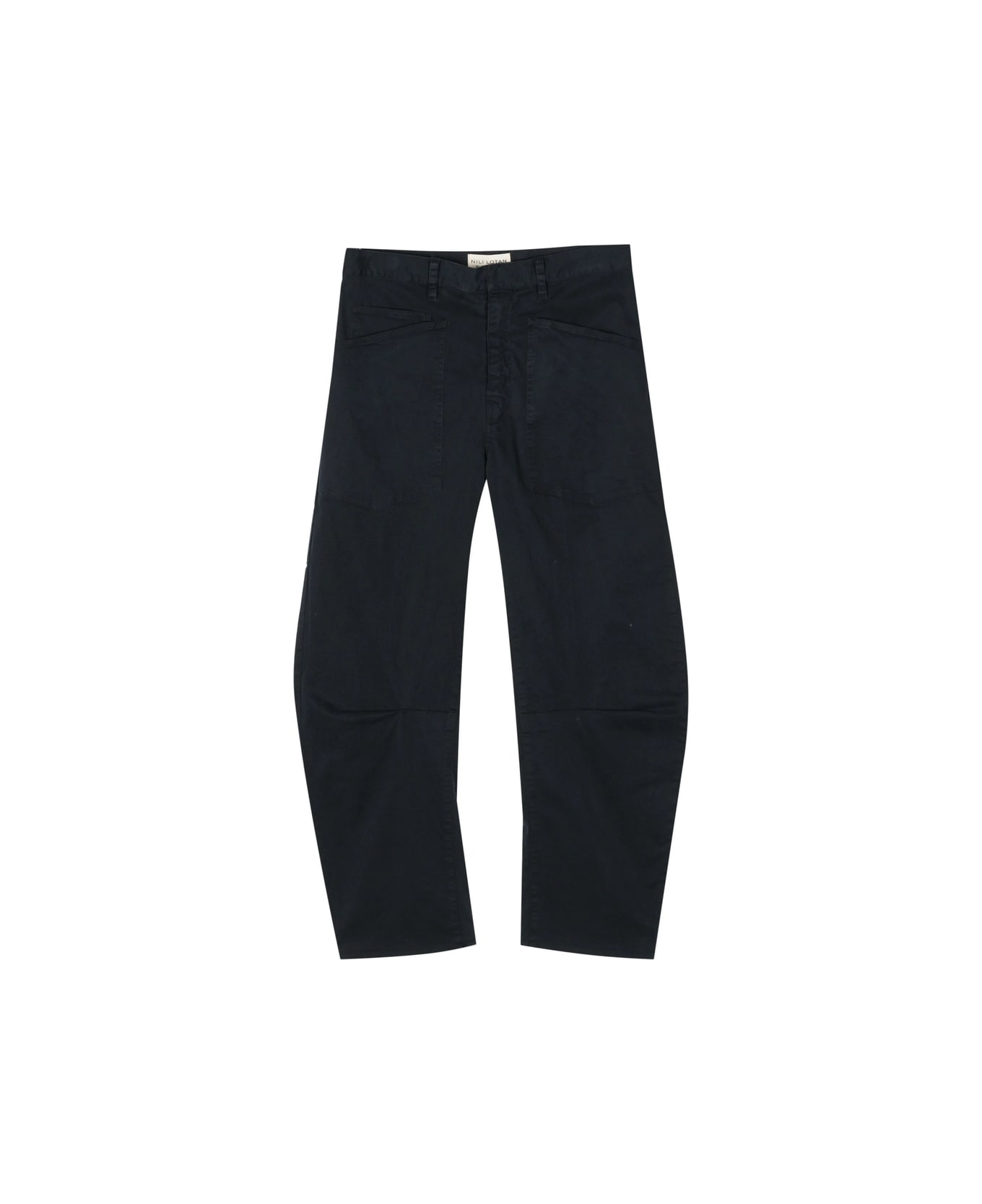 midnight blue stretch-cotton mid-rise belt loops three front patch pockets dart detailing tapered leg two rear patch pockets concealed front button, hook and zip fastening