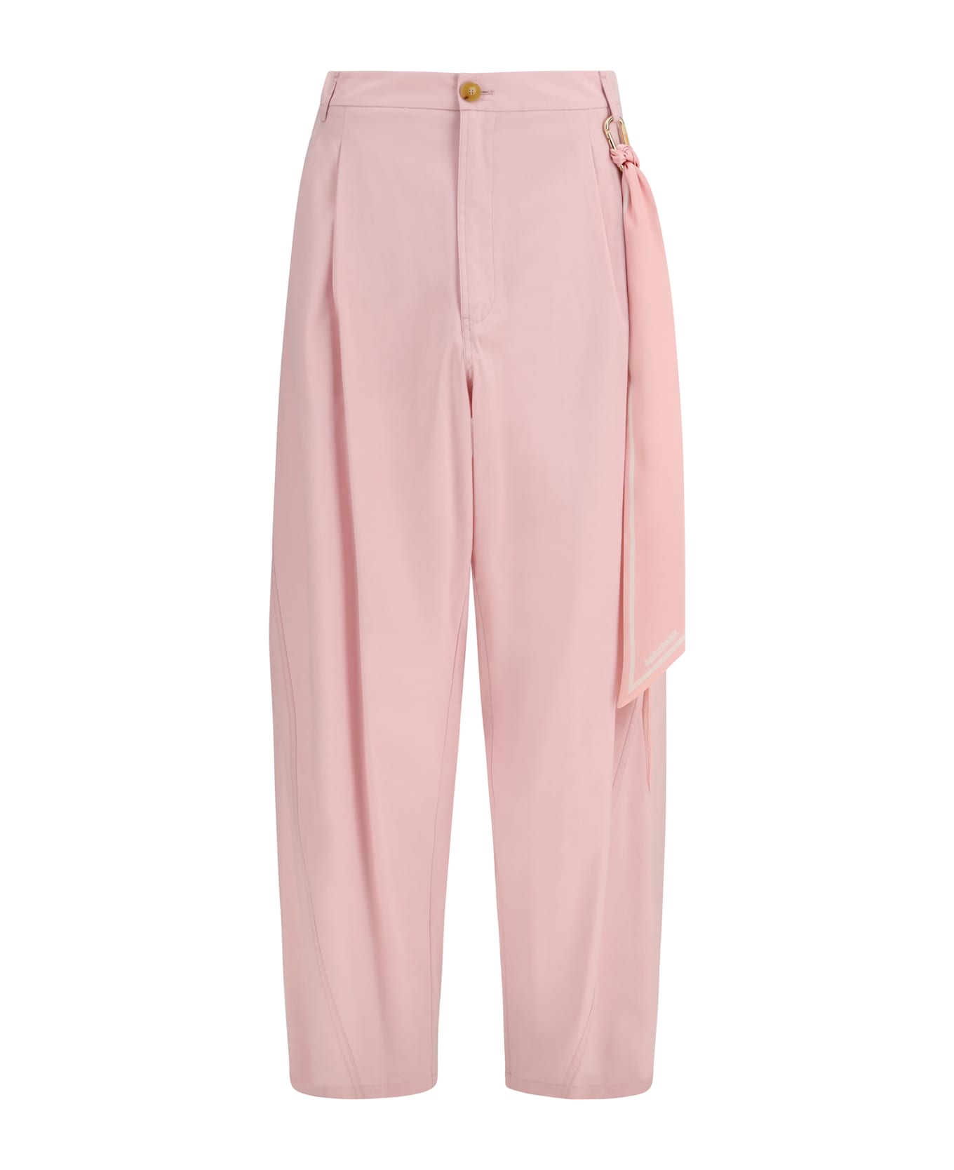 The phebe cotton pants by darkpark combine functionality and contemporary style in a design with attention to detail. made from high-quality cotton, they feature a front zip and button closure and belt loops. the model includes two side welt pockets and one back welt pocket, complemented by a removable logo keyring and a pink logo scarf. the front pleats add structure and definition to the silhouette, making these pants perfect for sophisticated and modern looks.