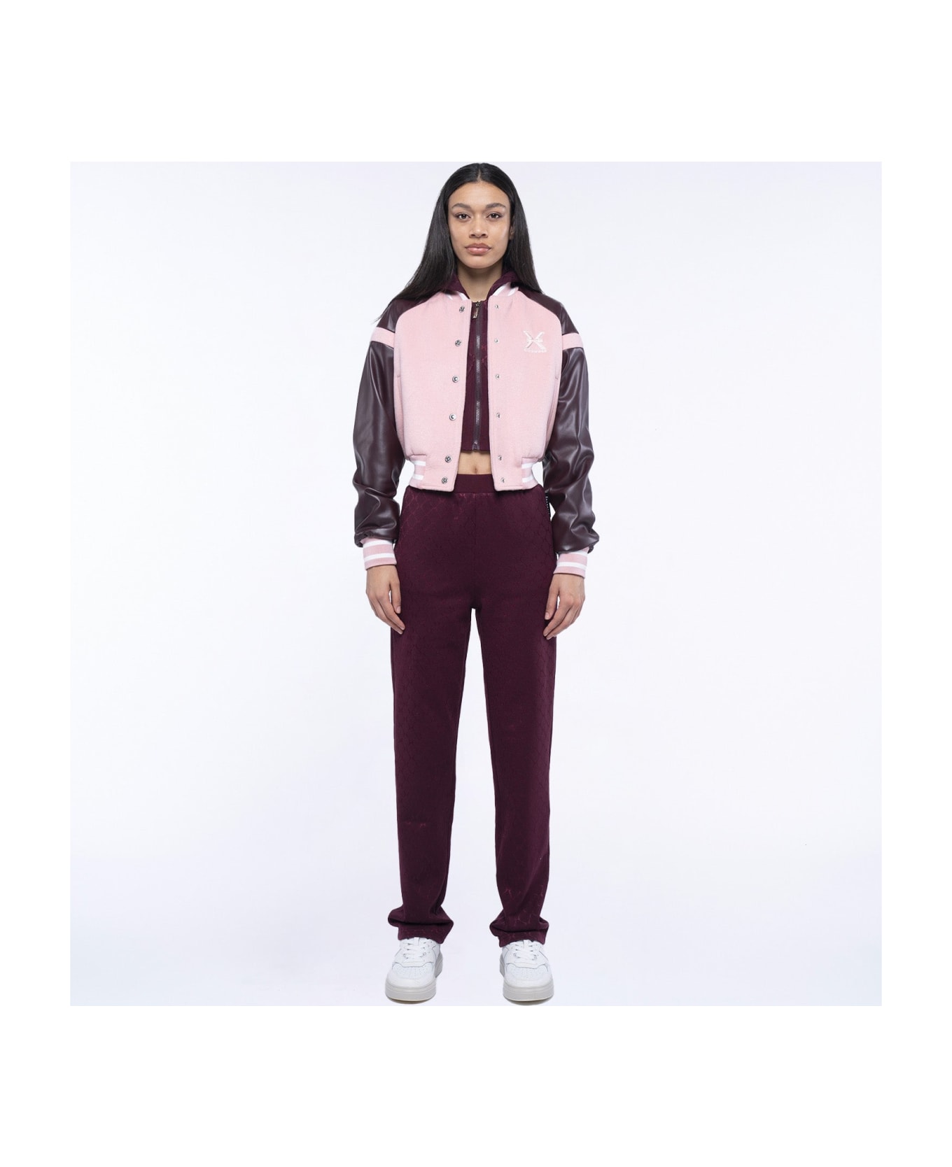 Varsity jacket with contrasting sleeves and button fastening. Elasticated waist.