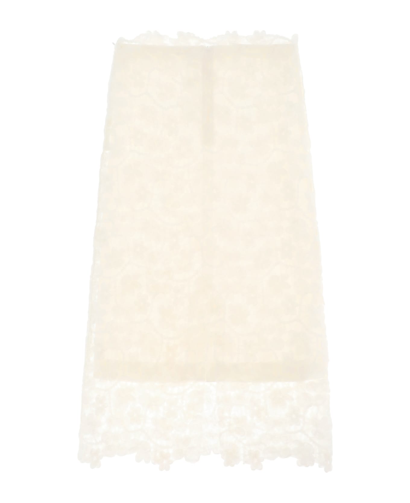 JIL SANDER midi skirt made from elegant floral lace revealing a cotton and silk fabric lining. Slightly flared A-line, side invisible zip closure. The model is 177 cm tall and wears a size XS. Composition: 100% poliestere, 84% cotone, 16% seta