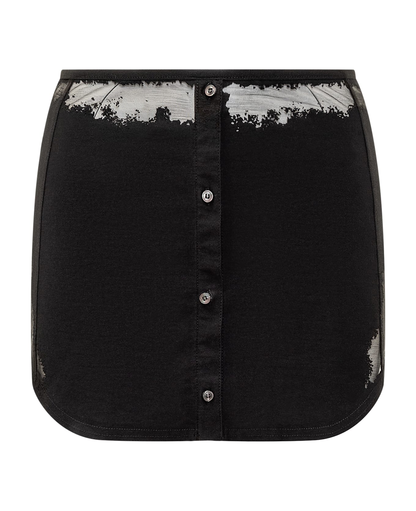 Black short skirt. Zip closure on the side. Buttons applied. Dévoré workmanship. Composition: 83% Cotton, 13% Polyester, 4% Elastane