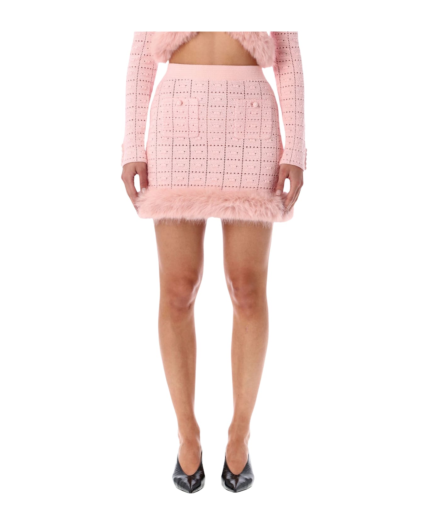 Playful Yet Refined, This Pink Pointelle-knit Mini Skirt By Self-portrait Exudes A Romantic Charm. Featuring An Elasticated Waistband And A Plush Faux Fur Hem, It Blends Comfort With Allure. Pair It With The Matching Cardigan For A Chic Coordinated Look Inspired By 90s Femininity. Stretch Pointelle-knit Fabric Faux Fur Hem In Matching Tone Elasticated High Waist Patch Pocket With Button Fitted Silhouette Alessandra Is 1,75 M And Wears Size S