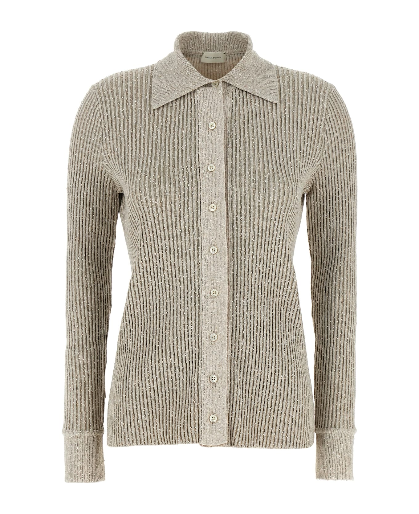 '21' ribbed viscose knit cardigan with 3D decorations, polo shirt with collar and front button closure, long cuffed sleeves. Composition: 67% viscose, 33% polyester