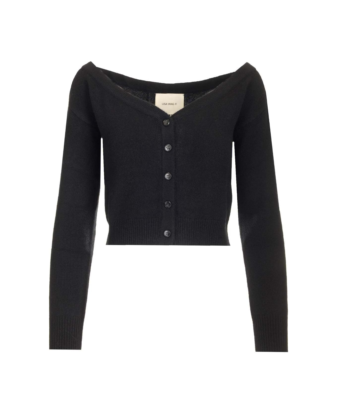 "Beata" cashmere knit cropped cardigan with off-the-shoulder design by Lisa Yang.