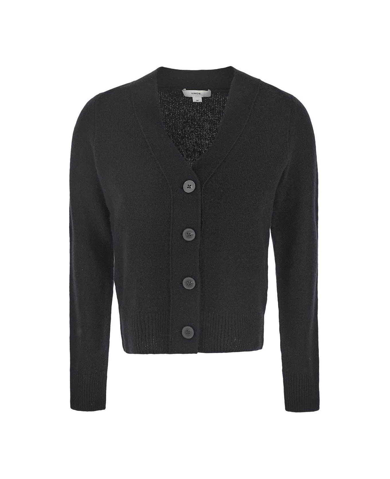 Vince cardigan in black cashmere with crop. It features by buttons closure, V neck and long sleeves.