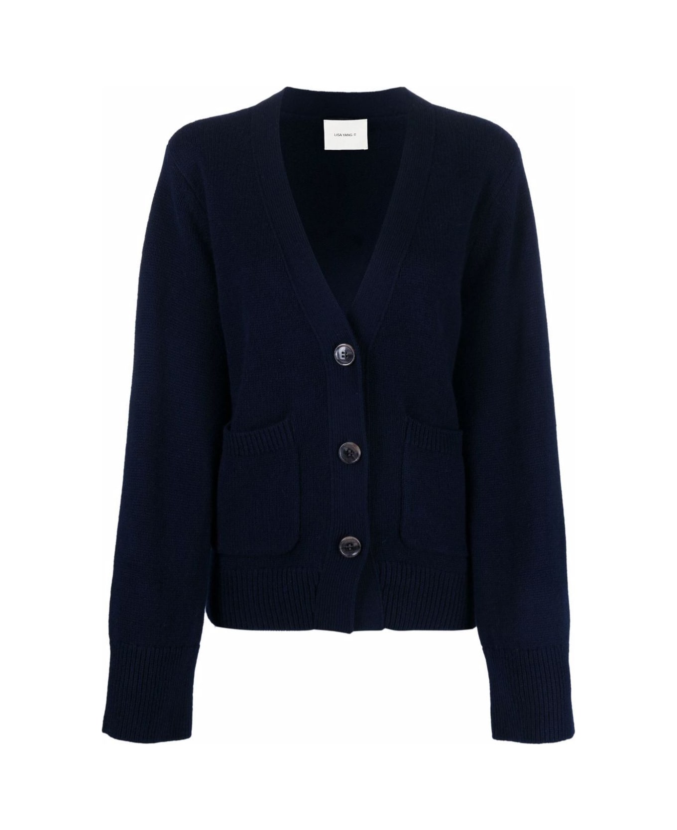 navy blue cashmere knitted construction two front patch pockets V-neck front button fastening long sleeves ribbed cuffs ribbed hem