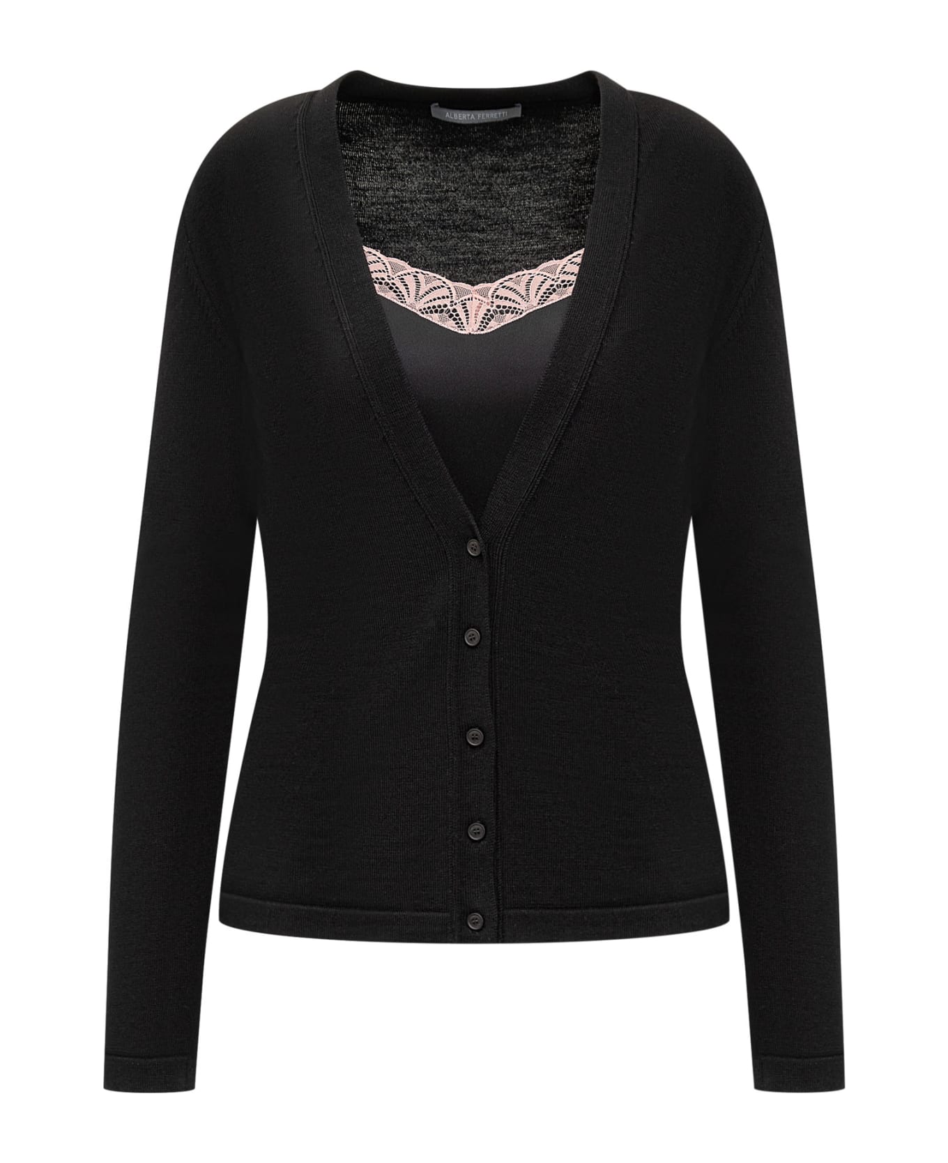 Merino wool long-sleeved sweater. V-neck. Button closure. Ribbed hems. Silk insert with contrasting pink lace.