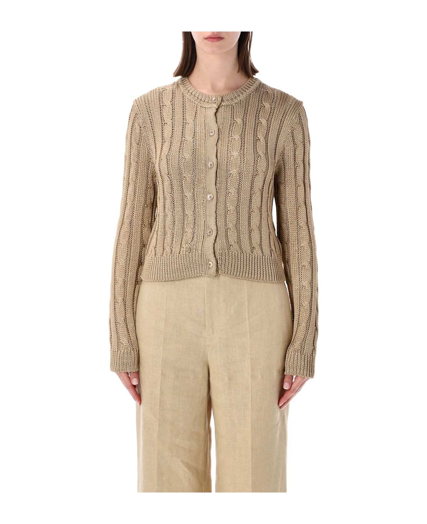 A Refined Reinterpretation Of A Timeless Classic, This Cropped Cable Knit Cardigan By Ralph Lauren Blends Artisanal Craftsmanship With Luxurious Silk Yarn. The Compact Silhouette Is Enhanced By A Round Neckline And Ribbed Finishes, While Signature Mother-of-pearl Buttons Add A Sophisticated And Distinctive Touch. Cropped Fit Crew Neckline Cable Knit Construction Silk Yarn With Luminous Finish Mother-of-pearl Buttons With Logo Ribbed Cuffs And Hem Alessandra Is 1,75 M And Wears Size S