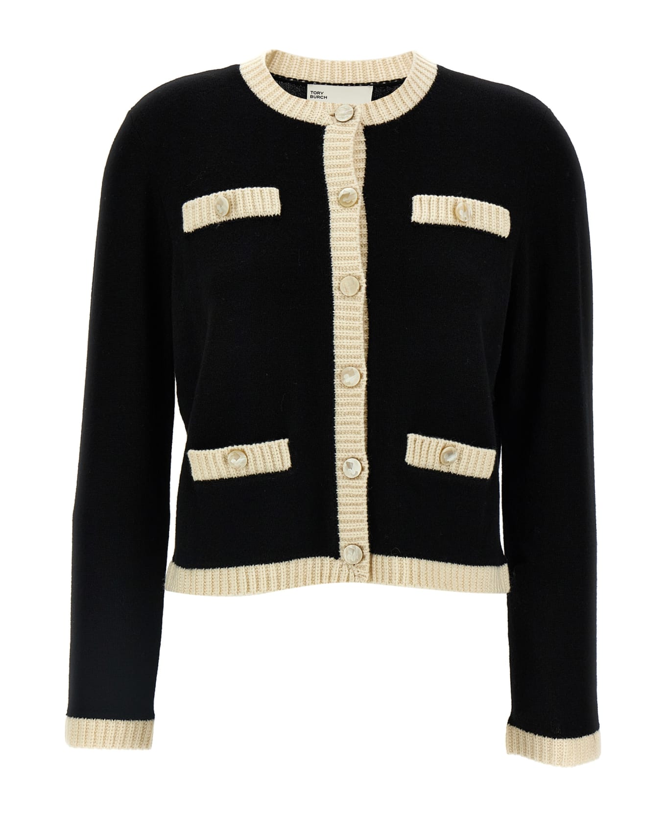 'Kendra' wool cardigan with crochet details, logo button closure, pockets, long sleeves.