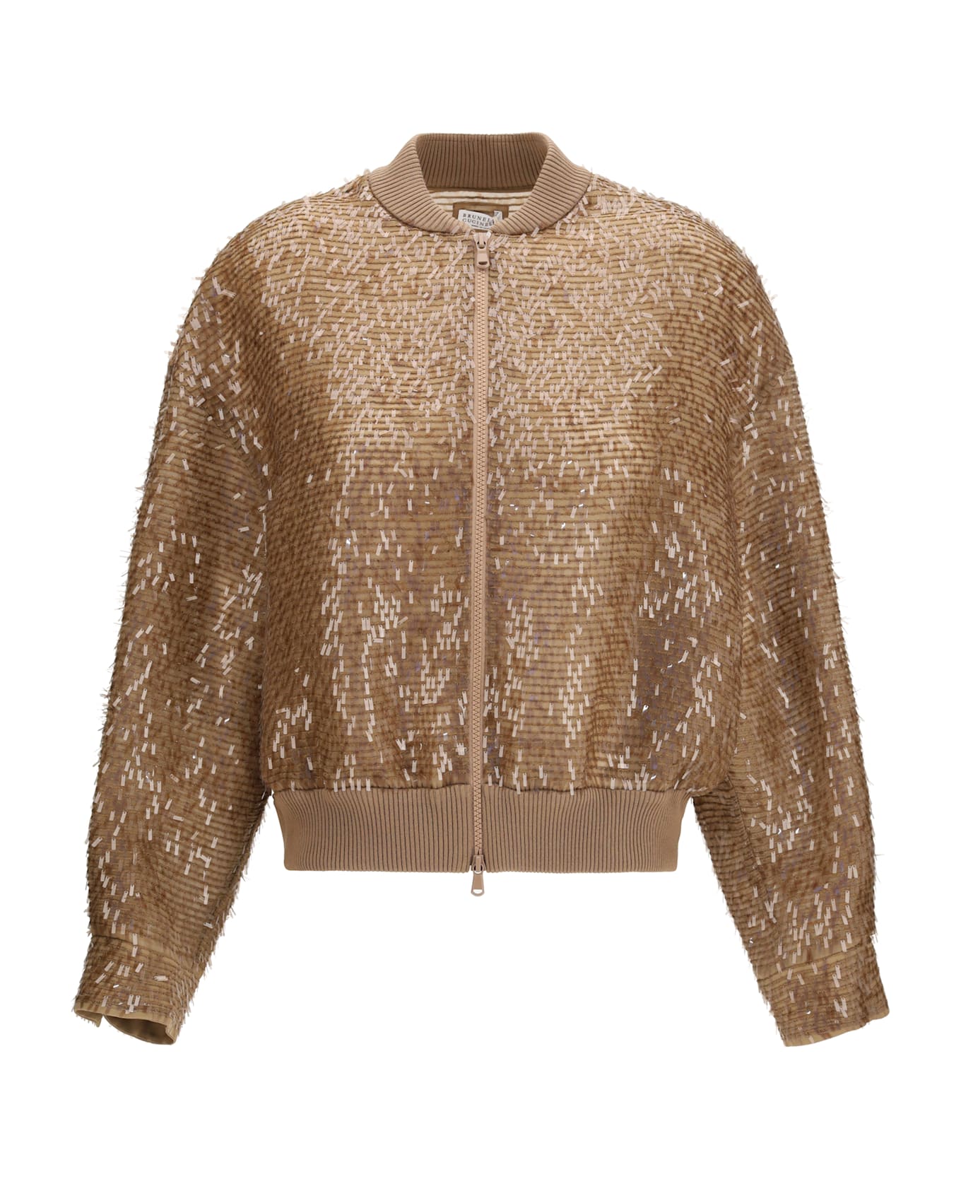 The sequin jacket by brunello cucinelli is an elegant and refined piece, featuring delicate sequin embellishments. it has a zip closure, ribbed collar and hem, and is crafted from 100% silk, combining luxury and comfort in a sophisticated and contemporary design.