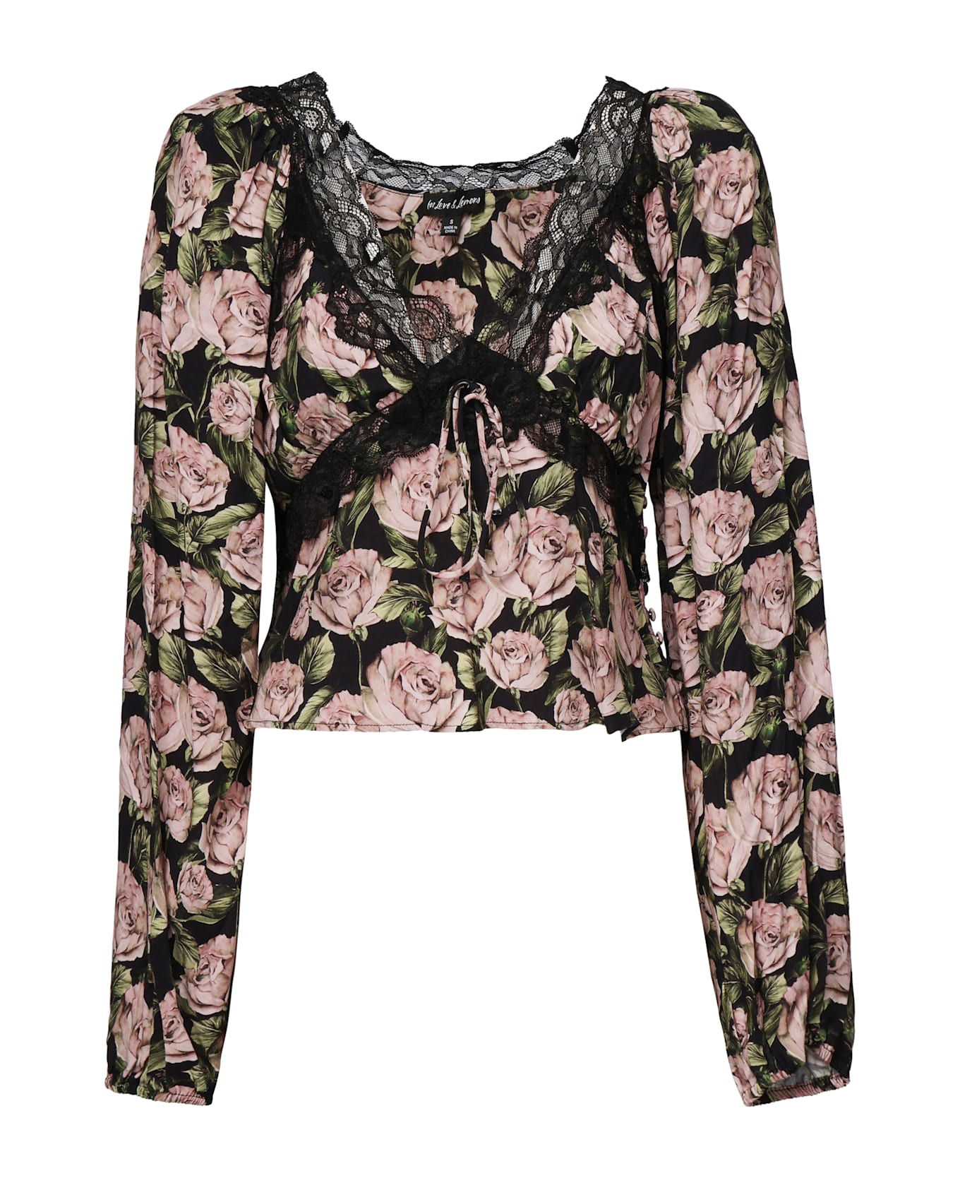 -Lined cups -Functional covered buttons and elastic loops on side seam -Elasticized sleeve opening -Long sleeves -Size shown in photo is S -Color: Multicolor