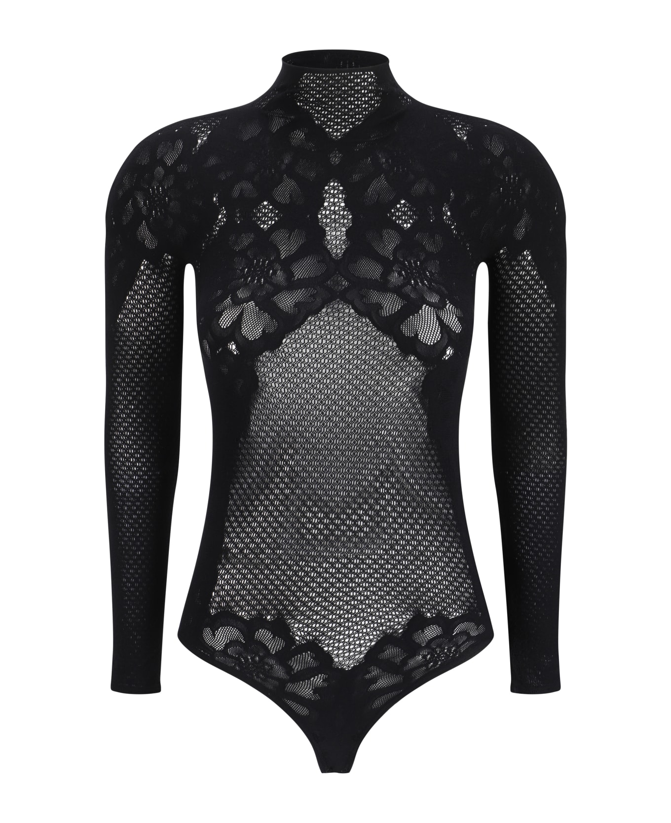 Lace tattoo bodysuit by wolford, long-sleeved pattern, semi-sheer floral design, high neck, close fit.