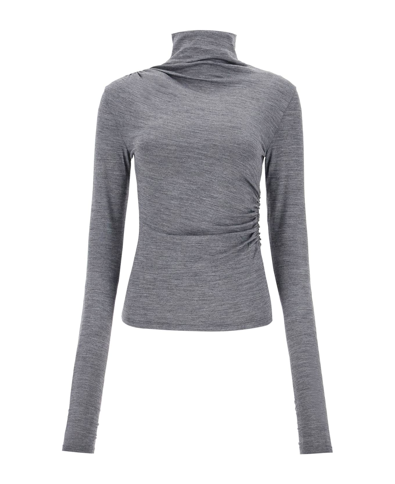 The Andamane high-neck top is made of lightweight stretch jersey with a wool blend. It features a slightly asymmetrical cut highlighted by ruching. Slim fit with extra-long sleeves. The model is 177 cm tall and wears size S.