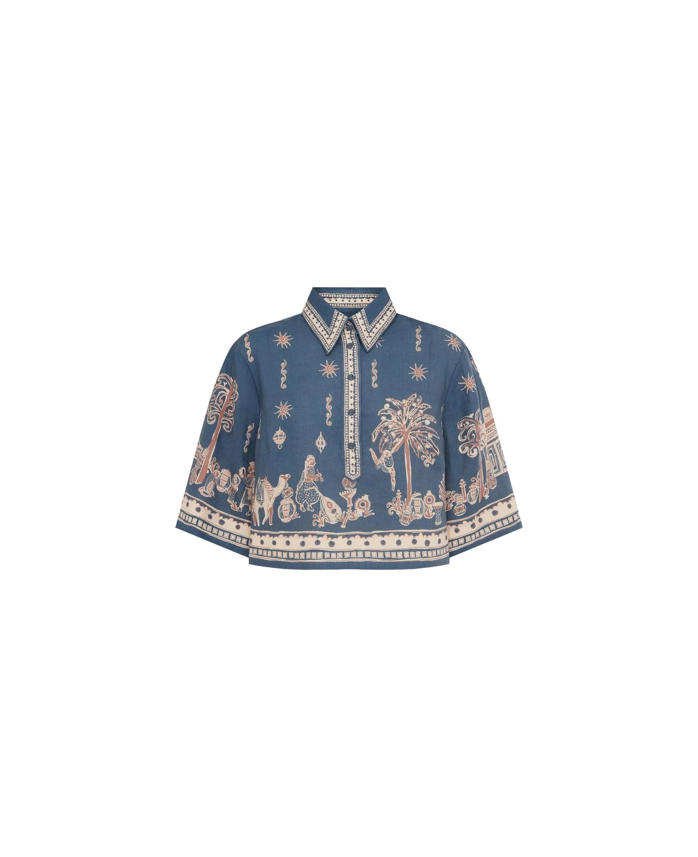 blue printed design button fastening collared border trim