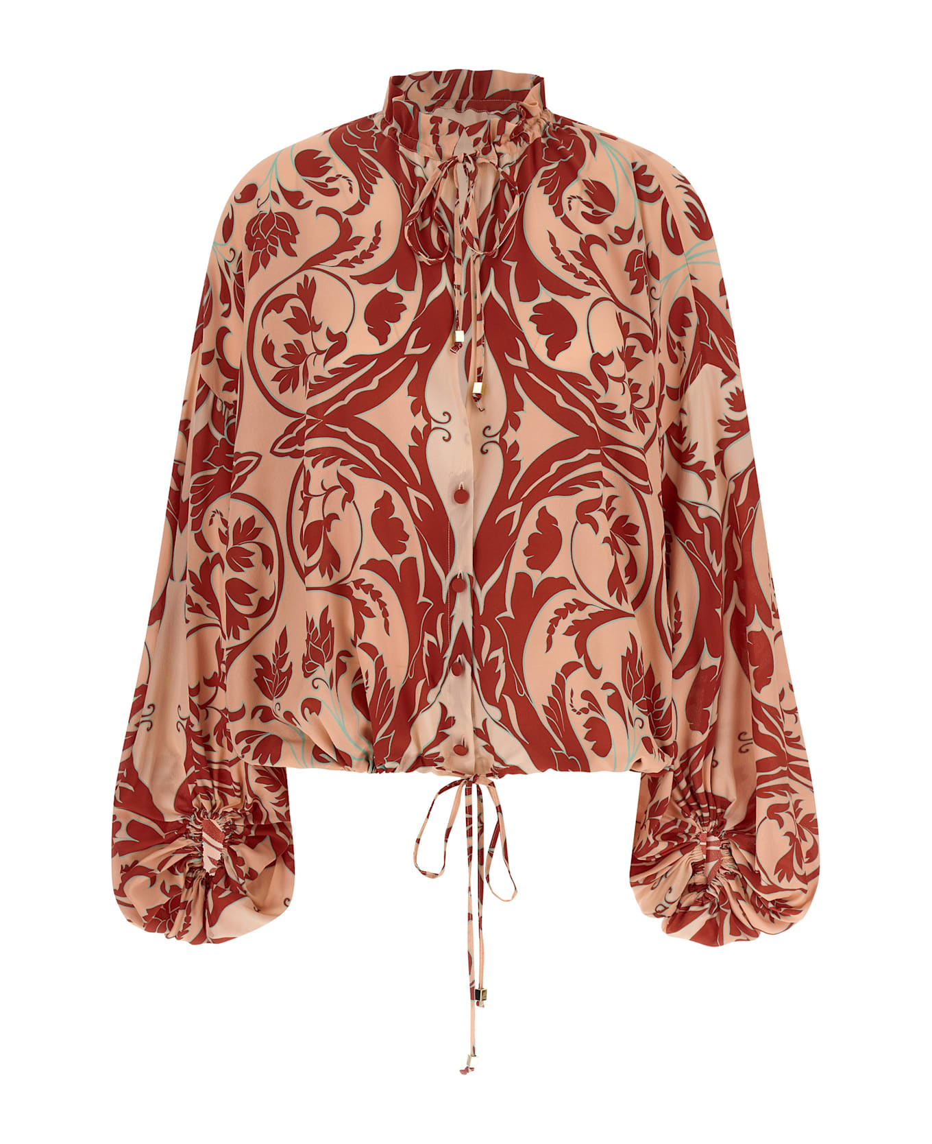 All over 'Braque Geometry Archilo' crepe de chine silk shirt with ruffle collar, adjustable V-neck with drawstring, front button closure, long balloon sleeves with elastic cuffs, drawstring at the hem.
