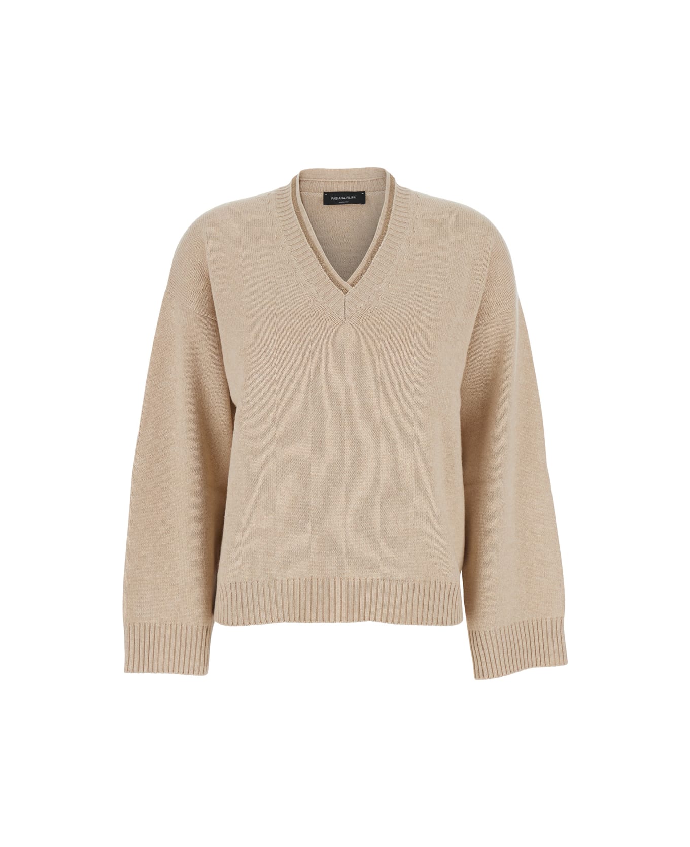 Beige V-neck Sweater In Wool And Silk Blend Woman